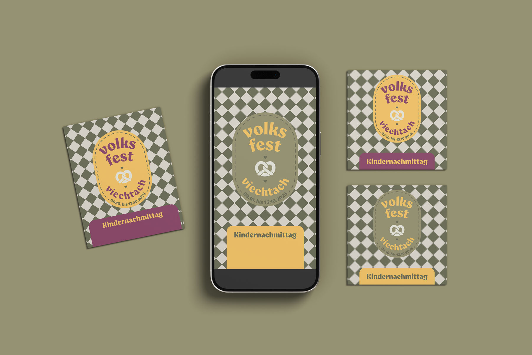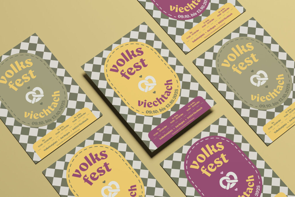 Elemente aus der Volksfestkultur wurden modern interpretiert, Farben und Muster neu gedacht und in ein auffälliges, modernes System übersetzt: Mit klaren Kontrasten und einem unkonventionellen Layout für ein Fest in der Region. Das Ergebnis: Ein Auftritt, der das Viechtacher Volksfest endlich mal wieder als Highlight positioniert. Wir würden mal stolz behaupten, hat ganz gut geklappt, oder?